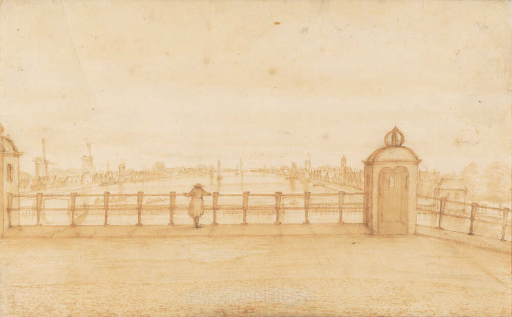 opschrift verso, in het midden: Amstelbrug te Amsterdam: in pseudo-17de-eeuws handschrift