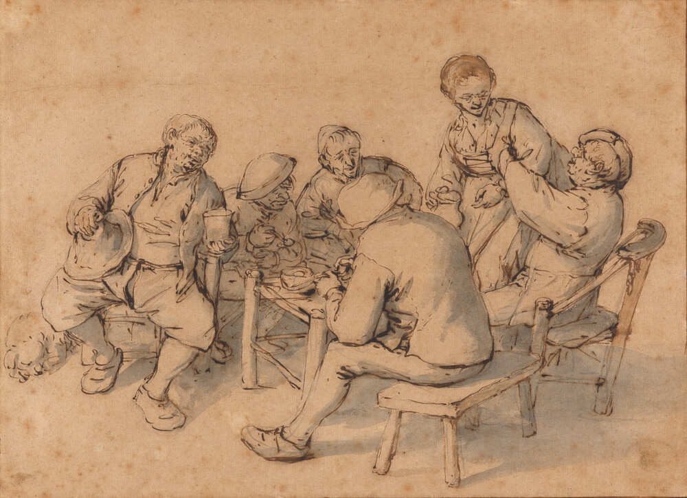 Ostade (Adrien Van). Cinq paysans assis à boire et à fumer. Une femme leur apporte un pot de bière ; à gauche, un chien couché. Morceau d'une admirable exécution, à plume et lavé d'encre de Chine. On y a joint l'eau-fort qu'en a gravée, en plus petit, F. Hillemacher. Ce beau dessin provient de la collection Van den Zande. La description que nous en donnons est extraite du catalogue rédigé par M. Guichardot' (fr. 3020,- , aan C.J. Fodor) ; Collectie C.J. Fodor, legaat 1860