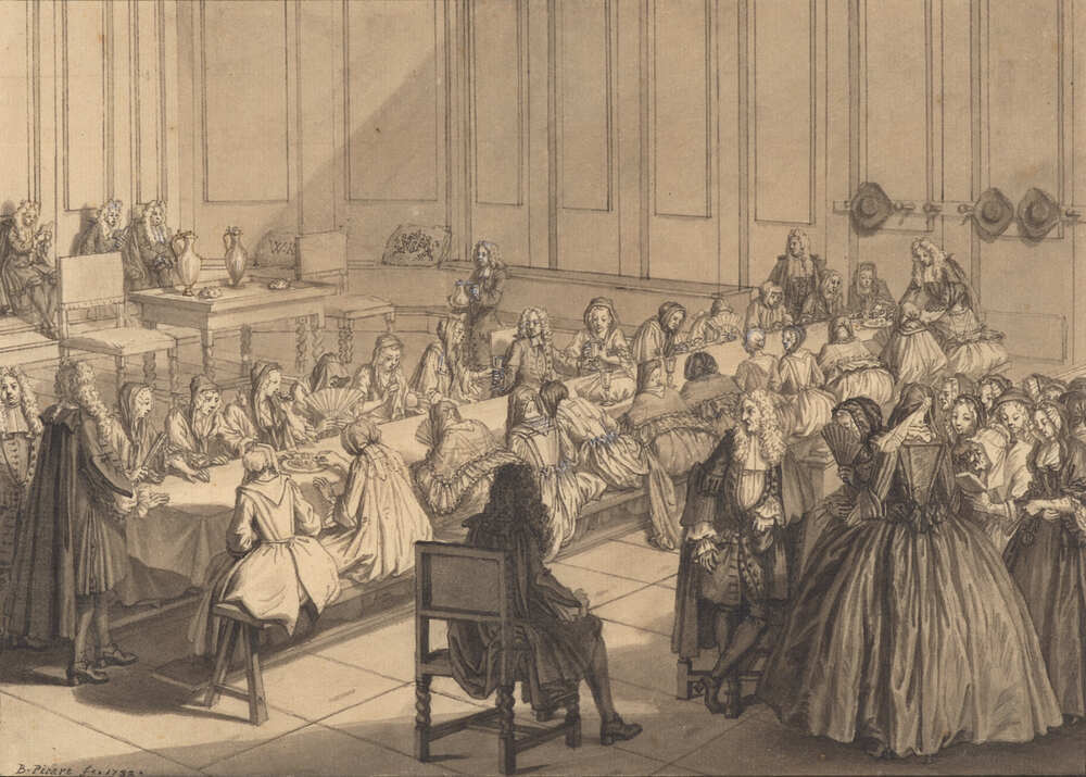 Op grond van de letters WK op het kussen, dat tegen de achterwand ligt, is door Van Eeghen vermoed dat deze scŠne is gesitueerd in de Walenkerk aan de Oudezijds Achterburgwal en niet in de Remonstrantse Kerk, zoals de voorstelling tot dan toe werd geduid. Aangezien in de begeleidende tekst wordt ingegaan op de gebruiken rond het Avondmaal bij de gereformeerden waartoe de Walen behoorden, zou de scŠne heel goed in een gebouw van de Waalse gemeente gesitueerd kunnen zijn. Vooralsnog is het interieur, dat overigens niet lijkt op dat van een kerk, echter niet met zekerheid ge‹dentificeerd. ( Ingrid Oud)