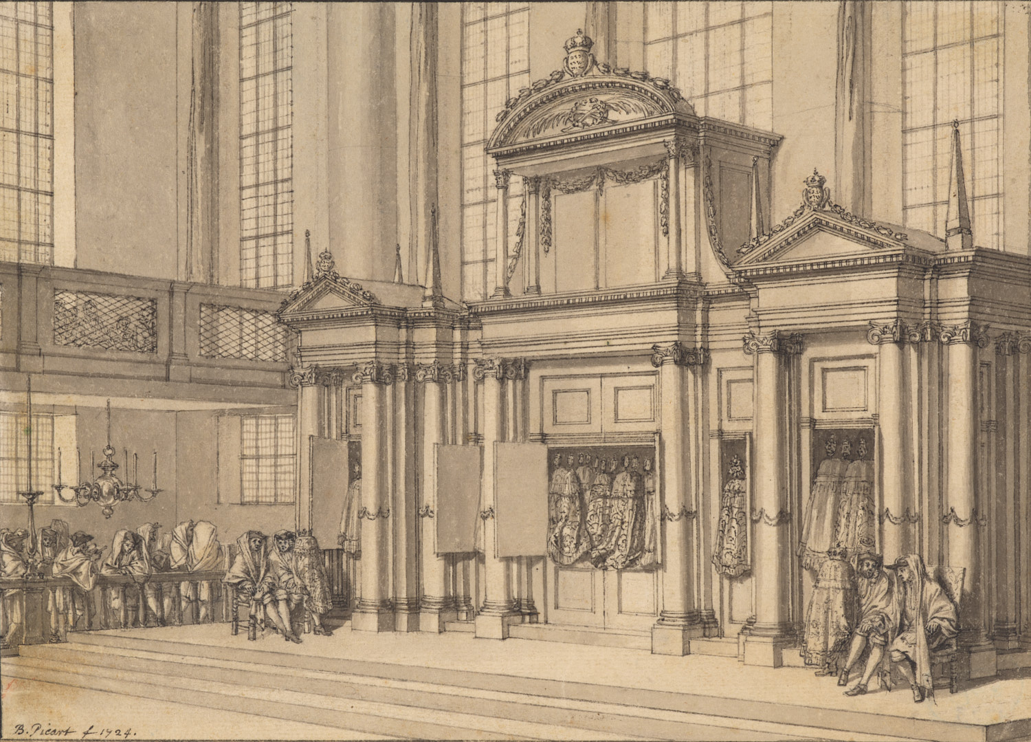 De oostwand van de Portugese synagoge in Amsterdam met de Ark, die is versierd met zuilen, kapitelen en festoenen (afb. a). In de Ark zijn de thorarollen opgeborgen.