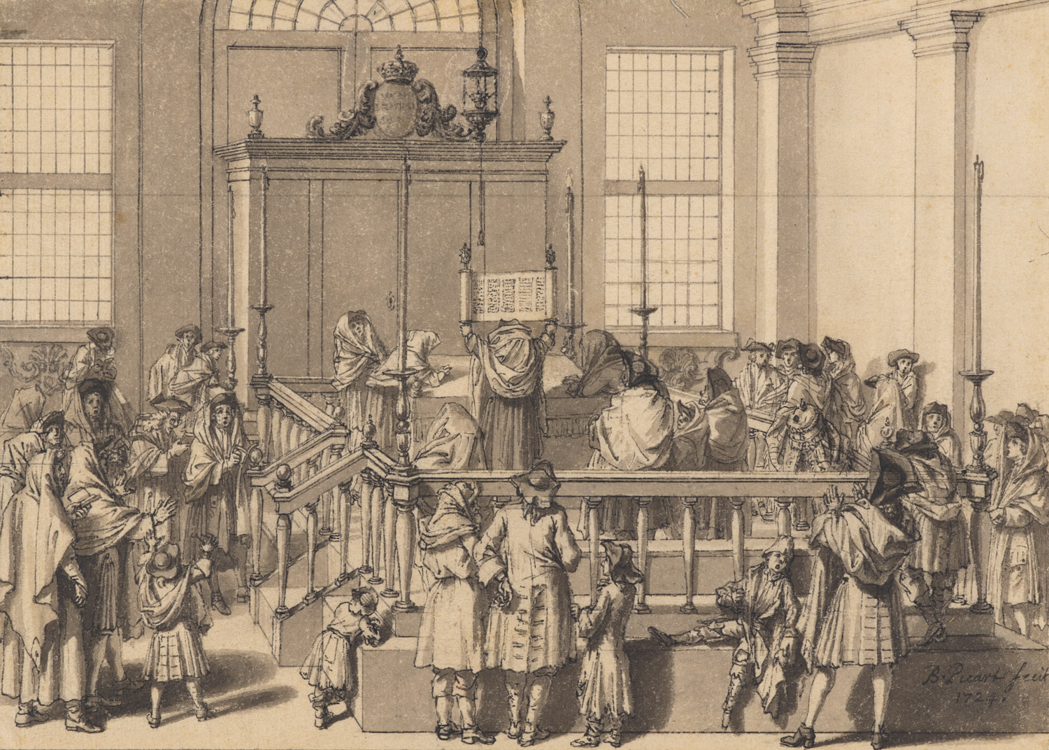 Deze prent geeft een beeld van de Portugees-joodse synagoge aan de Korte Voorhout in Den Haag van de gemeente Beth Jacob (Huis van Jacob), die van 1692 tot 1743 gebruikt werd, waarna de gemeente verhuisde naar een synagoge aan de Princessegracht. De gemeente werd gesticht door Jacob Pereira, die legerproviandeur van stadhouder Willem III was, en ook al had meegewerkt aan de bouw van de Portugese Synagoge te Amsterdam. De Synagoge aan de Korte Voorhout stond naast Pereira's huis, en een van de ingangen van de synagoge was in zijn woonhuis. ( Judith Kraamwinkel)