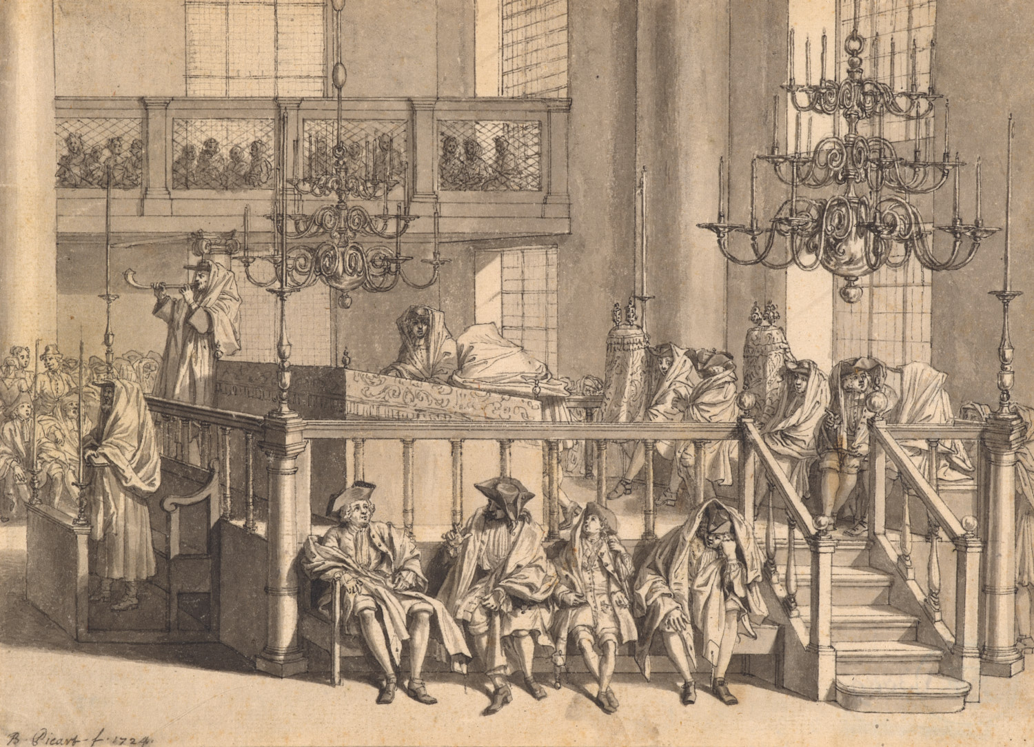 Het AHM bezit verschillende tekeningen gemaakt voor illustraties in het eerste en het vijfde deel, waarin joodse en prostestantse godsdiensten worden behandeld. In het overzicht van Picarts oeuvre uit 1734 staat vermeld dat zijn illustraties bij de joodse, de gereformeerde en enkele katholieke gebruiken zeer precies 'd'apres nature' zijn. Hiermee werd niet bedoeld dat de getekende scŠnes als het ware fotografische weergaven waren, maar dat hij op lokatie schetsen maakte die hij in zijn atelier gebruikte voor de ontwerpen. Enige voorbereidende schetsen zijn bewaard gebleven, bijvoorbeeld in Teylers Museum. Hier bevindt zich een studie door Picart voor zijn getekend model met het dichtmaken van een graf. In het Rijksprentenkabinet zijn enkele bladen met losse figuren of groepjes die Picart in een synagoge moet hebben geschetst. Een aantal van deze figuren gebruikte hij als stoffage in zijn illustraties met het interieur van de Portugese synagoge in Den Haag (cat. nrs. 122 en 121).