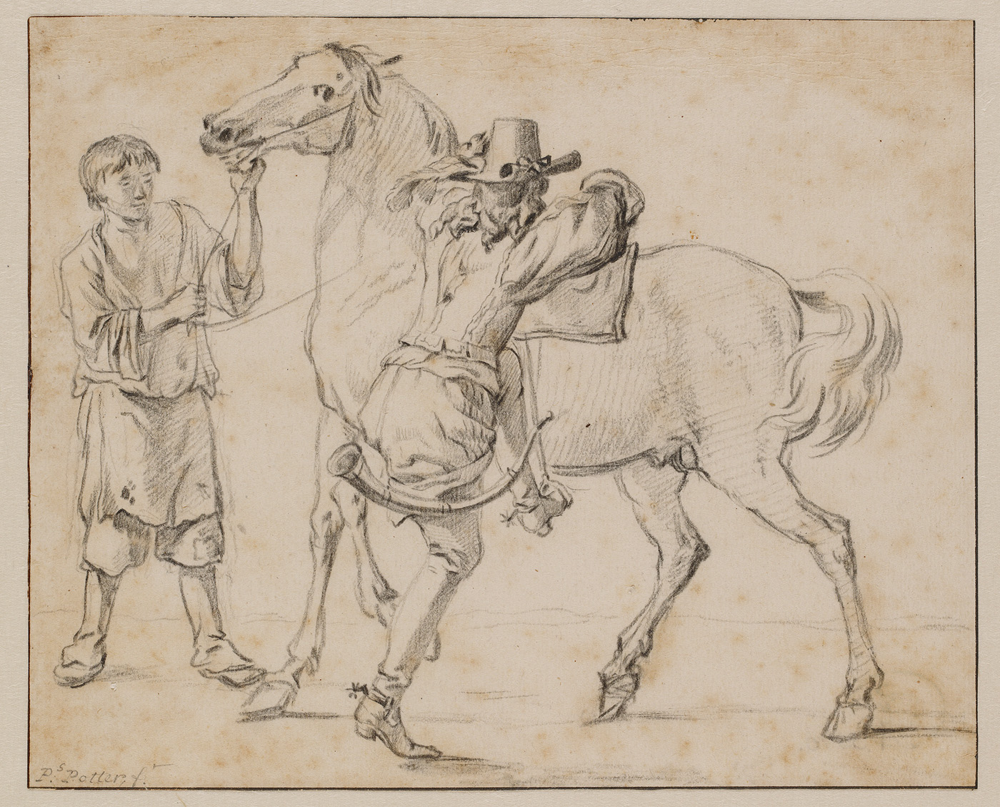 Veiling Tonneman 1754, p. 29, 't Konstboek Letter F, nr. 13: 'Een Heer die op zyn Paard klimt, met zwart kryt door Paulus Potter, hoog 6½, breed 7½ duim' (f 15,10-, aan Goll); Veiling Goll van Franckenstein 1833, p. 96, Kunstboek Z, nr. 2: 'Paulus Potter. Een Jager, een paard, dat door een man bij den toom wordt gehouden, bestijgende. Breed en mede zeer fraai met zwart krijt geteekend' (f 250,- ,aan Hulswit); Veiling Van Cranenburgh 1858, p. 12, Portefeuille E, nr. 99: ' Un chasseur monte à cheval, dont un garçon tient la bride; à la pierre d'Italie. Collection Goll 1833' (f 200,- , aan Lamme); Collectie C.J. Fodor, legaat 1860