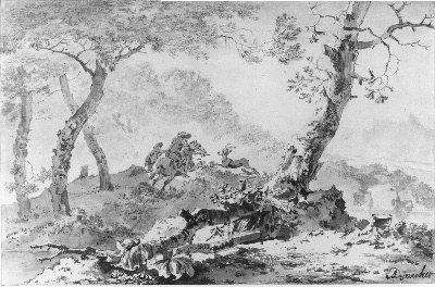 Veiling Goll van Franckenstein 1833, p. 113, Kunstboek GG, nr. 2: 'Adam Pynacker. Een bergachtig Landschap, op den voorgrond eenig opgaand geboomte, benevens een liggende boomstam; verder gestoffeerd met een jager te paard en een ander te voet, jagt makende op een hert. Geestig van licht en bruin en uitmuntend van teekening, als voren (met Oostindische inkt)'; Veiling Van Cranenburgh 1858, p.4, Portefeuille B, nr. 27: 'A Pynacker. Chasse aux cerfs. Au centre d'un paysage accidenté, des chasseurs sont à la piste d'un noble cerf. Lavé à l'encre de chine. Collection Goll 1833' (f 200,- aan Lamme) ; Collectie C.J. Fodor, legaat 1860