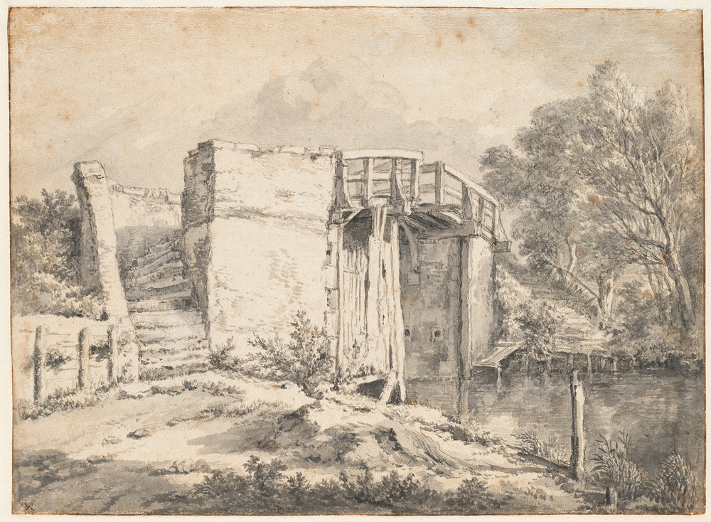 (?) Collectie D. Dalens II (1658/59-1688); Veiling Feitama 1758, p. 54, Letter H, nr. 15: 'Door Jacob Ruisdaal, omtrent Ao. 1670, met zwart kryt en Oostind. inkt. Een vervallen Bruggetje, by Alkmaar; door D. Dalens opgemaakt: h. 7¾, br. 10½ d.' (f 40:-:-, aan Van Dijk); Veiling Ploos van Amstel 1800, p. 106, Kunstboek T, nr. 6: 'Een hoog opgaande Brug, by Alkmaar, met Geboomte en Stoffagie; fraai met dito (zwart krijt) door J. Ruisdaal' (f 191:-:-, aan Josi, samen met nr 7: 'Het Accynshuis te Alkmaar'); Veiling De Bosch 1817, p. 26, Kunstboek B, nr. 5: 'Jacob Ruisdaal. Eene hooge steenen brug over een stil water, zijnde een gezigt buiten Almaar. Zeer schoon naar het leven geteekend met zw. krijt en o.i.i. h. 7¾, b. 10¾d.'(f 310:-:-,aan De Vries voor Molkenboer); Veiling Molkenboer 1825, p. 47, Kunstboek H, nr. 4:' J. Ruisdaal. Een hoog steenen Brug over een stil water bij geboomte, zijnde een gezigt buiten Alkmaar; zeer fraai naar het leven, met zwart krijt en Oostind. inkt (f 440,-); Veiling Van Cranenburgh 1858, p.16, Portefeuille G, nr. 148: 'J. Ruysdael. Un pont en pierre, moité en ruines donne passage à une petite bordée du côté par un massif d'arbres ; lavé à l'encre de chine. Collection de Bosch 1817' (f 300,-, aan Lamme); Collectie C.J. Fodor, legaat 1860