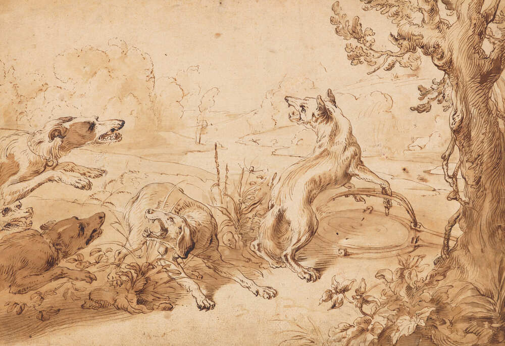 Coll. Mr. Baartz, veiling Rotterdam (A.J. Lamme) 6-8 juni 1860, Livre P. nr. 326:' F. Snyders. Un renard dans un piège se défend contre des chiens qui l´attaquent. A la plume et bistre.' (Fl. 61,- aan Lamme, voor Fodor). Legaat C.J. Fodor, 1860