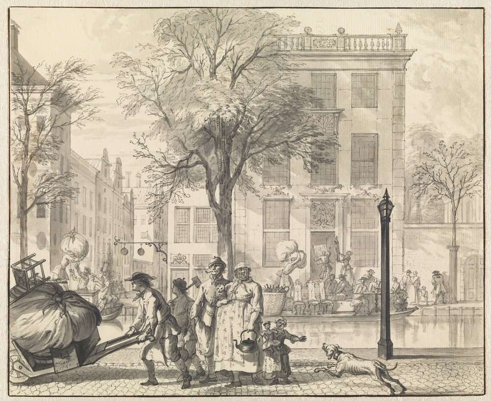 Op satirische wijze heeft Troost in zijn tekening de tegenstelling tussen arm en rijk weergegeven, zoals we die ook aantreffen in de 17de-eeuwse pendanten van de rijke en de arme keuken. De familie op de voorgrond verhuist met haar hele hebben en houden op een kruiwagen. Op de achtergrond is ook een verhuizing gaande. Daar wordt een rijke boedel door het personeel een statig grachtenpand ingedragen. De familie verblijft zolang op de schuit en zit er rustig aan tafel de bezigheden gade te slaan. ( Leonoor van Oosterzee)