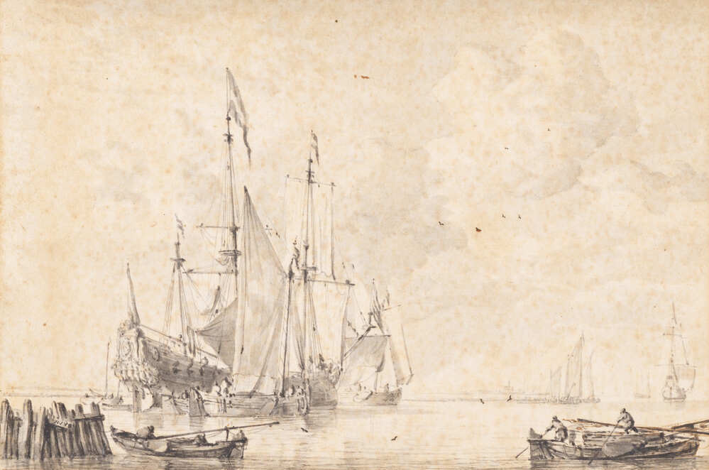 Veiling Tonneman 1754, p. 78, 'In 't Konstboek Letter P, nr. 20: 'Een excellent stil Watertje, met Oost Indische Inkt, door Willem van de Velde, hoog 5½, breet 8 duim' (f 77:-:-, aan De Winter); Veiling Fietama 1758, p. 47, Letter G, nr. 5: 'W. van de Velde. Een stil watertje met verscheidene Schepen; ongemeen kwik met Oostind. Inkt h. 5¼, br. 8 d.' (f 101:-:-, aan Broyel); Veiling Van Broyel 1759, p. 11, Letter B, nr. 65: 'Door Willem van de Velde. Een stil Watertje met diversche Schepen, zeer uitvoerig en meesterachtig geteekend, hoog 5¼, breed 7 ¾ duim' (f 101:-:-, aan Goll); Veiling Goll van Franckenstein 1833, p. 49, Kunstboek M, nr. 2: 'Willem van de Velde. Eene stille Zee met verscheidene drijvende en ten anker liggende oorlogs- en andere vaartuigen. Uitmuntend van toon en behandeling, met o.i. inkt' (f 243,-, aan Metayer); Veiling Six 1845, p. 4, Omslag B, nr. 52: 'W. van de Velde. Een stil Water met zeilende schepen en schuiten; met o.i. inkt' (f 250,-, aan Brondgeest); Collectie C.J. Fodor, legaat 1860