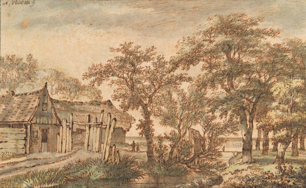 Veiling De Vos 1833, p. 6, Kunstboek B, nr. 6: 'Abraham Verboom. Een Boschgezigtje, ter zijde een boeren woning, schuur en hoog geboomte aan een watertje. Uitvoerig met de pen als voren (dun met sapverven).' (f 90,-, aan Hulswit); (?) Veiling Van Cranenburgh 1858, p. 2, Portefeuille A, nr. 8: 'A. Verboom. Paysage boisé avec maisons rustiques. Collection de Vos 1833' (f 67,-, aan Lamme) ; Collectie C.J. Fodor, legaat 1860