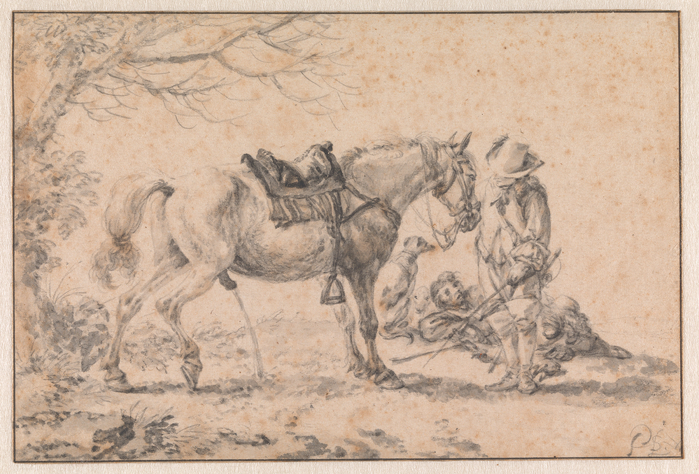 Veiling Tonneman 1754, p. 51, Kunstboek K, nr. 21: 'Een dito, zynde twee Ruiters met een Paard , van denzelven (Philips Wouwerman), hoog 5, breet 7½ duim' (f 10:1:-, aan De Winter); Veiling Feitama 1758, p. 22, Letter C, nr. 25: '(Van Philips Wouwerman) Een Pissend Paardje, waar voor staat een Heer met een Karrewas, in zyn hand, zeer fraay geyteekend met zwart kryt en Oostind. Inkt: h. 5½, b. 7¾ d.' (f 162:-:-, aan Yver); Veiling De Vos 1833, p. 34, Kunstboek K, nr. 1: 'Philips Wouwerman. Het zoogenamd pissend Paardje; een man houdt hetzelve bij den toom vast, een ander ligt bij hem op den grond, en nevens deze twee honden. Uitmuntend fraai met zwart krijt en dun met o.i. inkt' (f 1220:-:-, aan Claussin); Veiling De Claussin 1844, p. 28, nr. 83: 'Du même (Philips Wouwerman). Le chaval qui pisse. Sur le premier plan, à droite, un cavalier par la bride un cheval qui pisse ; plus loin, un homme couché près deux chiens ; au bas du terrain, de ce même côté, le monogramme du maître. Précieux dessin d'une grande finesse d'exécution, à la pierre noire, lavé à l'encre de la Chine et au bistre. H. 13 c. 5 m., L. 20 c.'(f 1220,-); Veiling Verstolk van Soelen 1847, p. 13, Livre C, nr. 69: ' Philips Wouwerman. Ce dessin, connu sous le nom du 'cheval qui pisse' est d'un grand fini d'exécution et un des plus beaux de l'artiste, dont les dessins achevés sont d'une grande rareté. Un militaire tient par la bride un cheval pie sellé; plus loin se trouve un chasseur assis avec deux chiens de chasse et quelque gibier. L'exécution de ce chef d'ouvre, dessiné à la pierre d'Italie et à l'encre de chine, est admirable et ne laisse rien à désirer. Il est gravé par J. Bylaart' (f 1341,-, Aan Brondgeest); Collectie C.J. Fodor, legaat 1860