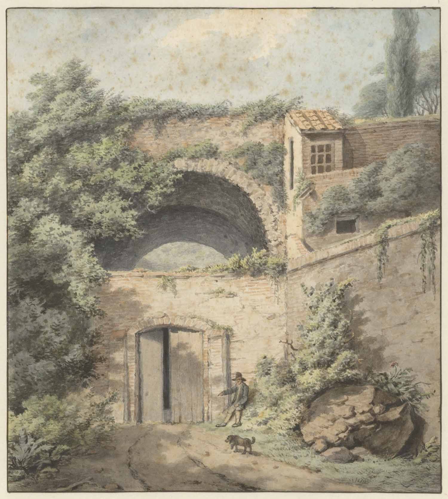 Apostools tweede reis naar Italië vond plaats in 1823, het jaar waarin ook deze tekening is gedateerd. Op deze waterverftekening is de ingang van de Villa Mecenata te zien, een goeddeels geruïneerd gebouw dat voor veel kunstenaars deel uitmaakte van de grand tour. De Villa Mecenata, ook wel de Villa van Maecenas, werd in 1874 ontdekt door arbeiders. Het gebouw fungeerde vermoedelijk oorspronkelijk als heiligdom en ontmoetingsplaats. Kunstenaars op reis door Italië maakten dankbaar gebruik van de begroeide ruïne, wat te zien is aan de vele schilderijen, prenten en tekeningen die van de Villa werden gemaakt. Het gebouw paste perfect bij het Italiaanse, classicistische schoonheidsideaal uit de late achttiende- en vroege negentiende eeuw. De Villa is te vinden op werken van Nederlandse contemporaine kunstenaars als Hendrik Voogd (1768-1839), maar ook op die van Fransen, waaronder Claude-Joseph Vernet (1714-1789).