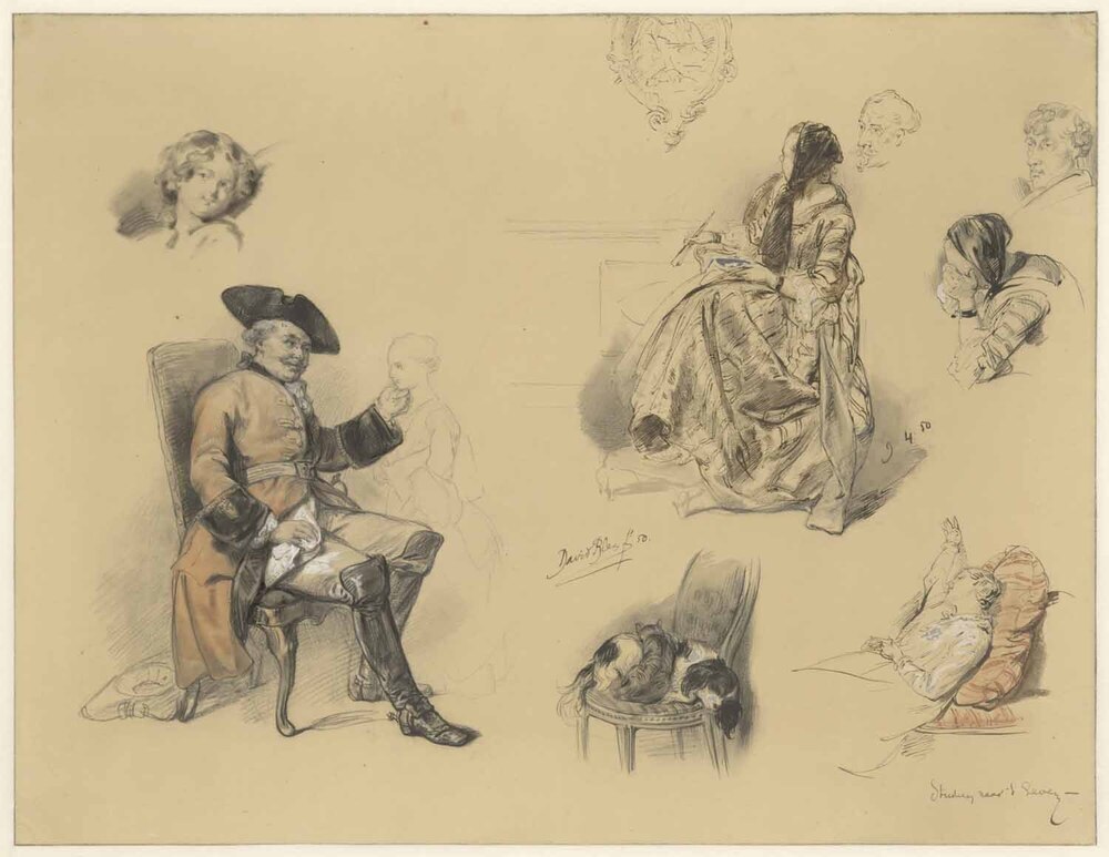- papier, rood krijt, krijt, O.I. inkt, inkt, zwart krijt