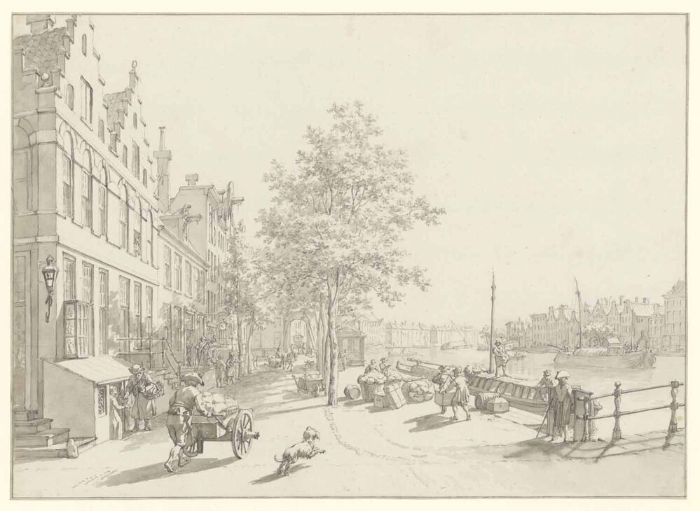 Langs de kade in de Binnen-Amstel lagen in Cats' tijd de veerschuiten richting 's-Graveland. Het stukje Amsteloever tussen Kloveniers- en Groenburgwal heet nu nog steeds naar deze ligplaats: 's-Gravelandse Veer. Rechts op de tekening is nog net de brugleuning te zien van de Halvemaansbrug over de Binnen-Amstel, gelegen in het verlengde van de Halvemaansteeg en de Kloveniersburgwal. Op de kade liggen grote balen te wachten op verder transport. Cats tekende dezelfde lokatie nogmaals vanaf de Groenburgwal.