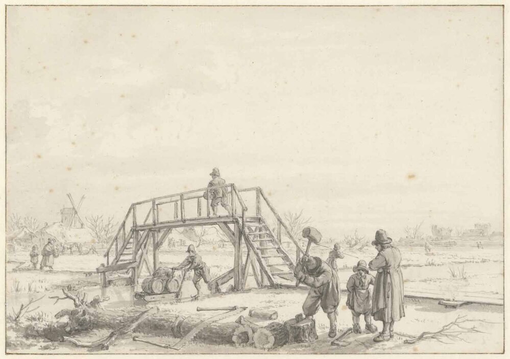 Twee bladen met een zo goed als identiek winters landschap (cat. nrs. 36 en 37) waar een houthakker bezig is bij een hoog houten voetbruggetje, een zogenaamde kwakel. Dit motief komt al voor bij 17de-eeuwse kunstenaars als Jan van Goyen (1596-1656) en Adriaen van Ostade (1610-1685) (De Jongh/Luijten 1997, pp. 272-275, nr. 55).