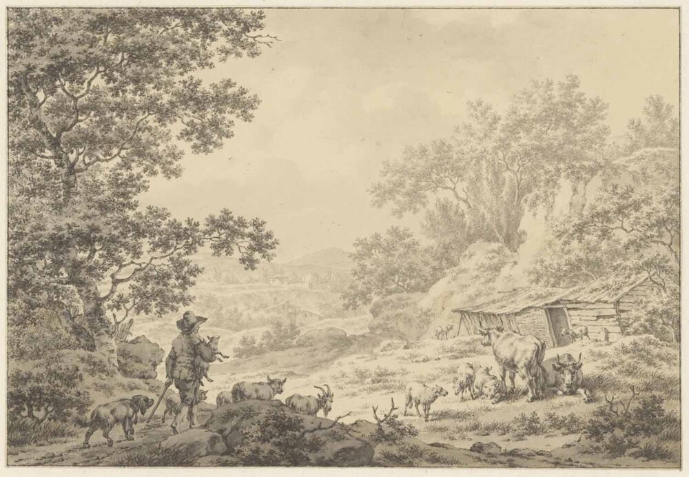 Behalve Hollandse landschappen tekende Jacob Cats bergachtige landschappen met herders en vee, die herinneren aan werk van italianisanten als Nicolaes Berchem (1620-1683) en Adriaen van de Velde (1636-1672). Cats had een uitgesproken voorkeur voor het maken van pendanten, die tezamen aan verzamelaars werden verkocht. Veel van die tegenstukjes zijn sindsdien los van elkaar in verschillende collecties terecht gekomen. Het opschrift Ÿ 63 de 2 aan de keerzijde van dit landschap geeft aan dat het samen met een thans onbekend blad is verkocht. ( Ingrid Oud)