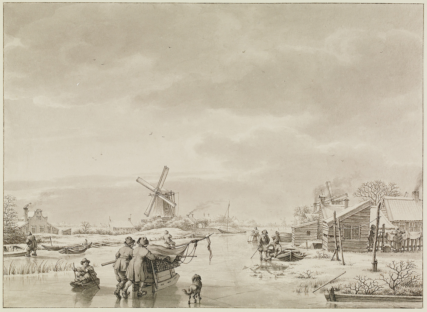 Een winterse blik op de Kostverlorenvaart in noordoostelijke richting naar de Haarlemmerweg, ter hoogte van het Lange Bleekerspad. Links aan het water staat een volmolen. Cats maakte de tekening vlak voordat op deze plek een tolbrug werd bouwd, toen ‚‚n van de schaarse vaste oeververbindingen over de vaart. Nu herinnert de naam van de nabijgelegen Tolbrugstraat nog aan deze verbinding. De getekende lokatie ligt niet meer buiten de stad: de huidige De Clercqstraat kruist daar de Kostverlorenvaart.