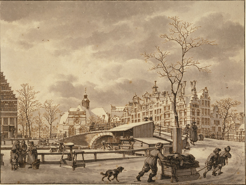 De situatie ter plekke is niet veel gewijzigd, zelfs de meeste gevels van de grachtenhuizen zijn nog te herkennen. In Cats' tijd was de Brouwersgracht op die plaats iets smaller en waren de kades iets breder. Zoals op de tekening is te zien stonden er lage hekjes op de kade. Tegen de brug staat een houten optrekje, vermoedelijk een winkeltje. Op de voorgrond tekende Jacob Cats een soort barkrukken, waarvan er ‚‚n bijna manshoog is. Op een andere tekening van Cats komt eveens zo'n kruk voor. Er staat een mand bovenop, die wordt volgeladen met stenen. Blijkbaar werden de krukken gebruikt bij het verslepen van zware lasten. De mand hoefde niet van de grond getild te worden, maar kon van de hoge kruk gelijk op de schouder worden gezet.