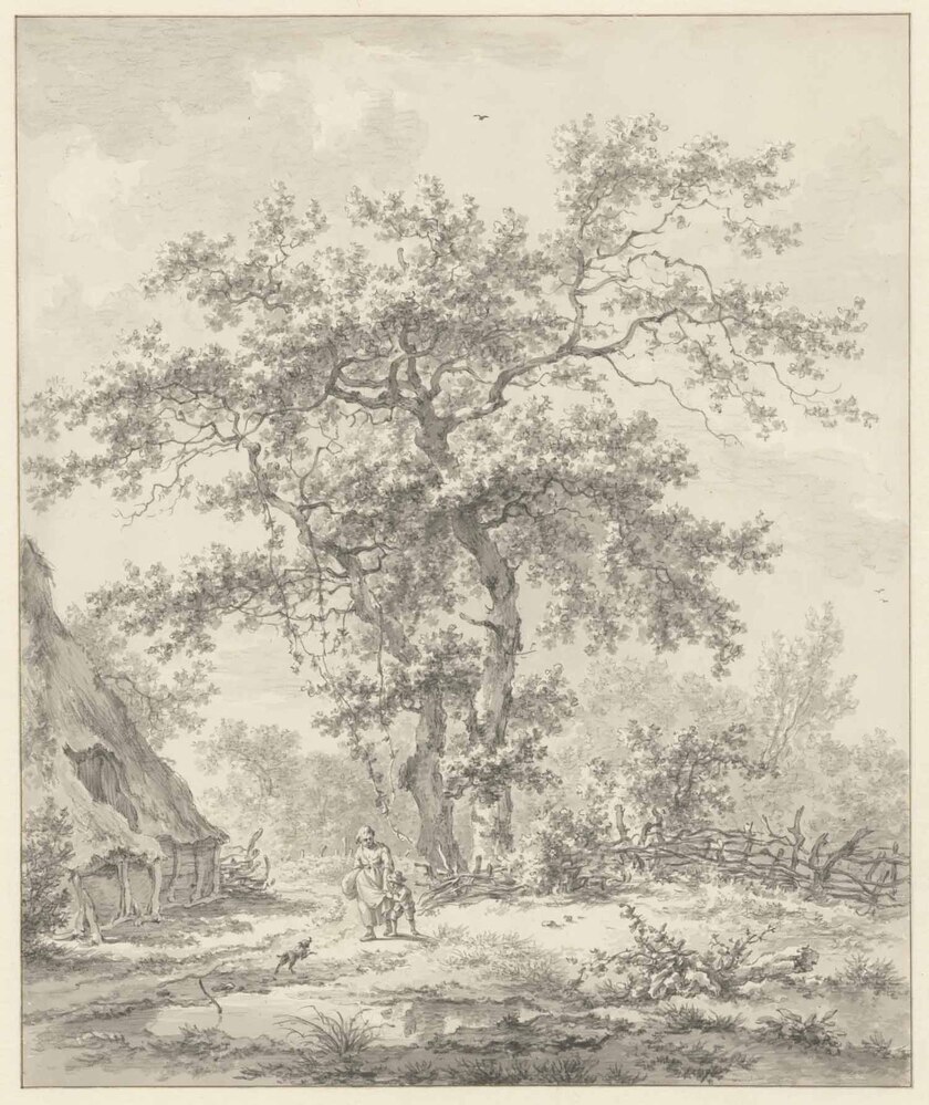 Het verticale formaat van deze tekening en van Een boerderij onder een hoge boom (cat. nr. 57) is ongewoon in zijn getekende oeuvre. ( Ingrid Oud)