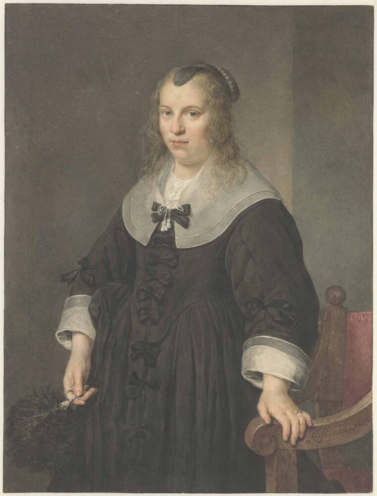 Op deze tekening is een statige vrouw te zien in een zwarte jurk, die rond de mouwen en kraag met wit is afgezet. Met haar linkerhand leunt ze op een stoel, en in de rechter houdt zij een zwarte waaier. Johannes Pieter de Frey (1770-1843) kopieerde dit werk naar een origineel door Govert Flinck (1615-1660), wat zich thans in een particuliere collectie bevindt. Zelfs de signatuur nam hij over; op de armleuning van de stoel is G.flinck.1654 te lezen. De verso van het werk laat echter weten dat het wel degelijk is getekend door de Frey: J: De Freij. fecit. Johannes de Frey was voornamelijk bekend als prentmaker en in veel gevallen zijn van werken die hij natekende ook etsen bekend, maar in dit geval is er geen versie als prent bekend.