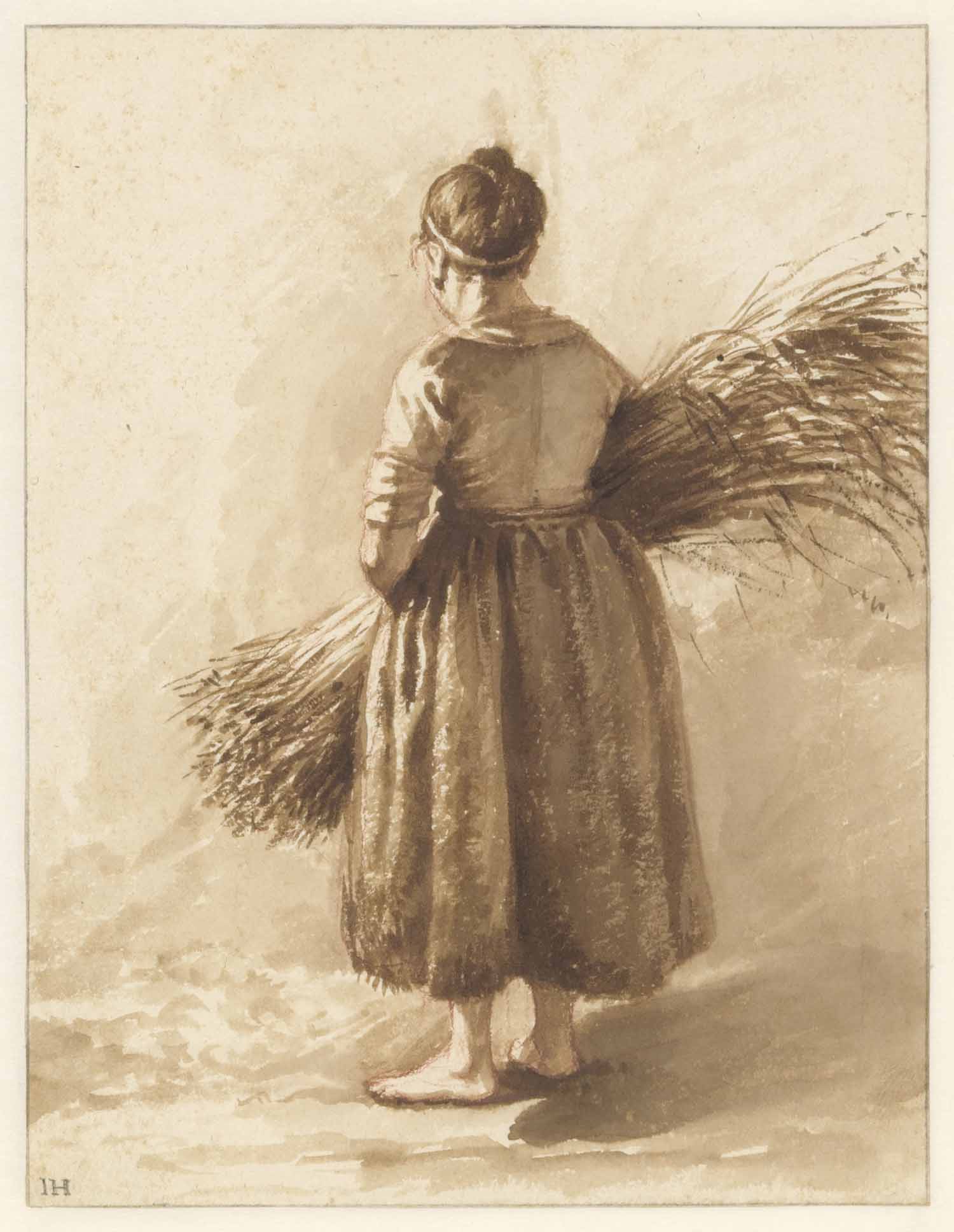 Dit werk is uitgevoerd in rood krijt en gewassen met sepia. Het betreft een figuurstudie van een blootsvoets meisje met een enkellange jurk en een band om het hoofd, die een bos takken of riet vasthoudt. Meerdere iconografische en stilistische elementen wijzen erop dat deze tekening in de context van een tekengenootschap is vervaardigd. In de eerste plaats het feit dat het meisje gekleed is in een landelijke stijl; voor geklede figuurstudies kozen deze genootschappen bijna altijd mensen van lagere standen. Ook komen vaak blootsvoetse rugfiguren voor bij deze studies. Dit wijst erop dat het werk bij een modeltekensessie een tekengenootschap is gemaakt.