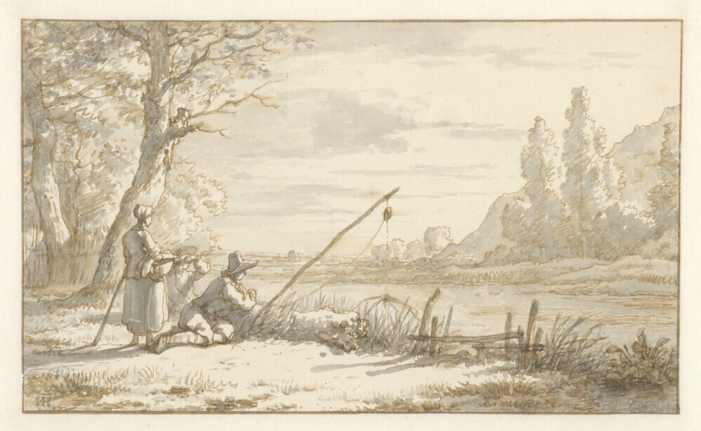 De schets die direct naar de natuur is gemaakt bevindt zich in de Ecole des Beaux-Arts te Parijs (inv. nr. 1731 verso). Het Rijksprentenkabinet bezit de tekening die het dichtst bij de schets in de buurt komt, op deze tekening is de compositie aantrekkelijker gemaakt (RP-T-1942-44). De tekening in de Witt collectie van het Courtauld (inv. nr. 3536) en de tekening van het Amsterdam Museum zijn direct gebaseerd op het werk uit het Rijksprentenkabinet. De beeldelementen uit de laatstgenoemde tekening worden herhaald en de twee werken zijn afgemaakt tot zelfstandige tekeningen.