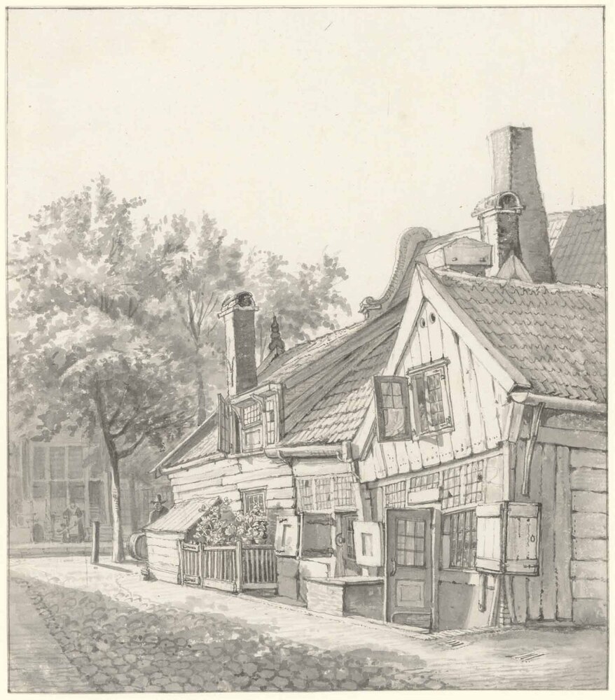 Gerrit Lamberts (1776-1850) kreeg in 1810, op rijkelijk late leeftijd, tekenonderwijs van Daniël Kerkhoff (1766-1821). Voorafgaand aan zijn formele onderwijs beoefende hij de tekenkunst wel als liefhebberij. Lamberts was vanaf 1824 werkzaam als eerste opzichter van het Rijksmuseum in het Trippenhuis. Deze tekening is typerend voor het soort topografische gezichten die Lamberts vaak maakte, zijn stille stads- of dorpsgezichten waren bedoeld voor de verkoop aan verzamelaars. De openstaande ramen en deuren van de gebouwen suggereren dat er menselijke activiteit plaatsvindt in de straat. Doordat Lamberts deze activiteit niet verbeeld, er zijn slechts drie figuren op de achtergrond zichtbaar, creëert hij een serene rust. De nadruk van deze tekening ligt dan ook duidelijk op de pittoreske gebouwen. De rust op de tekening wordt verder versterkt doordat de tekenaar de lucht volledig leeg heeft gelaten. Van Lamberts is bekend dat hij veelvuldig door Nederland reisde en gebouwen in diverse steden natekende. Het is echter niet bekend waar hij deze gebouwen getekend heeft. ( Mike Hermsen)