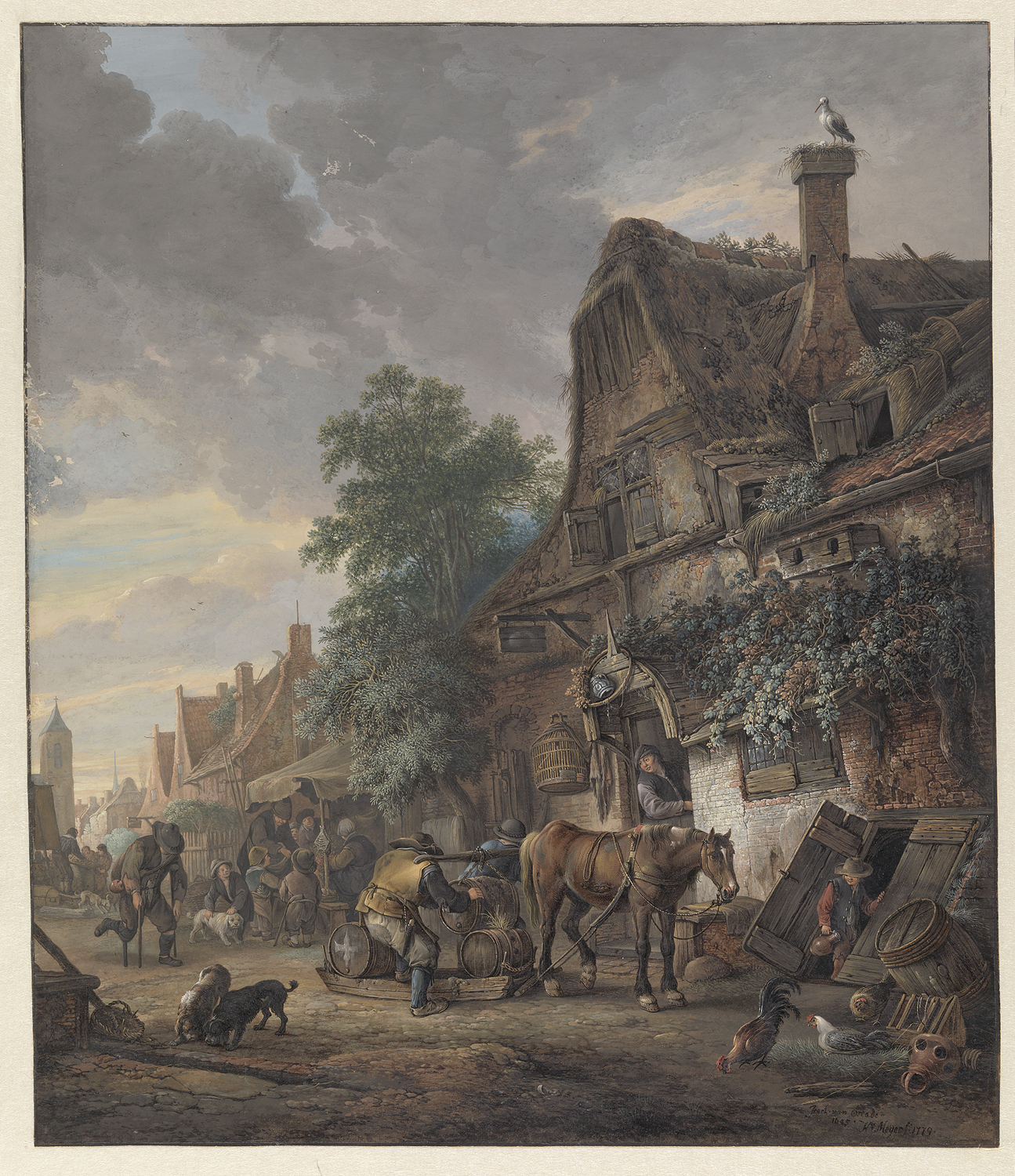Hendrik Meyer was behalve behangselschilder een bekend tekenaar van minutieus uitgevoerde gekleurde landschappen. In zijn precieze tekenstijl maakte hij deze kopie naar een schilderij van Isack van Ostade (1621-1649) (afb. a). Meyer kan het stuk gekopieerd hebben, toen het in bezit van de verzamelaar Van Tol was, die in Zoeterwoude woonde. Meyer verbleef van 1775 tot zeker 1779 in Leiden, daar niet ver vandaan. Een mogelijkheid is ook dat hij het schilderij kopieerde tijdens de kijkdagen, voorafgaande aan de veiling van de nalatenschap Van Tol op 15 juni 1779 in Amsterdam. ( Ingrid Oud)