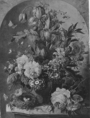 - Eene vaas met verschillende bloemen op eene steenen tafel, 1800 - 1861