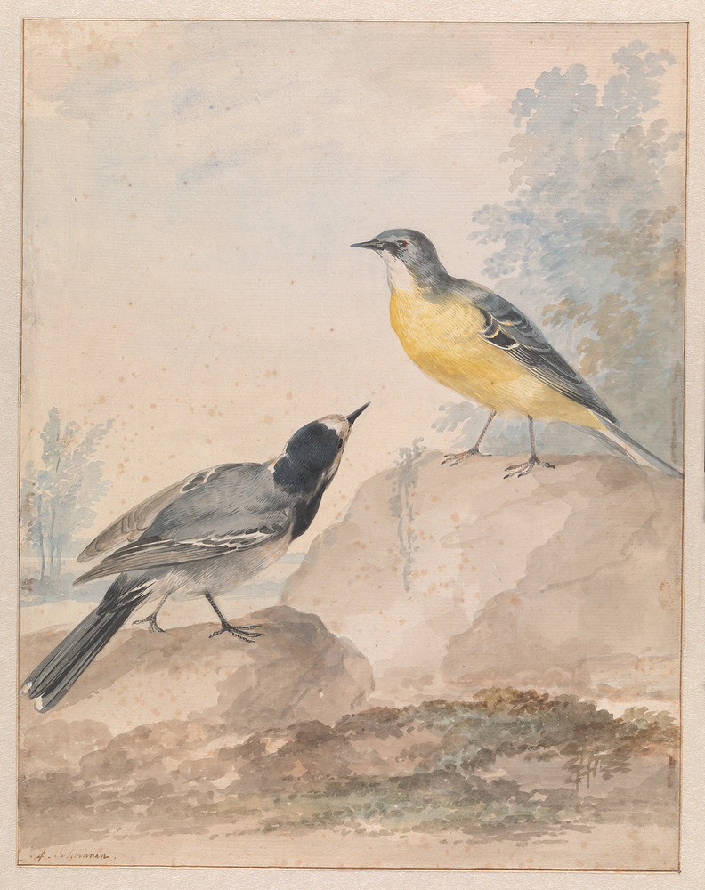Op deze tekening in het AHM beperkte Schouman zijn annotatie tot de soortnamen van de voorgestelde vogels: geele en bonte kwikstaart. Kwikstaarten zijn kleine inheemse zangvogels met een lange staart, die voortdurend in beweging is. De gele kwikstaart kenmerkt zich door een gele borst. Schouman bedoelde met de bonte kwikstaart waarschijnlijk een witte kwikstaart die behalve met witte ook met grijze en zwarte veren is getooid. ( Ingrid Oud)