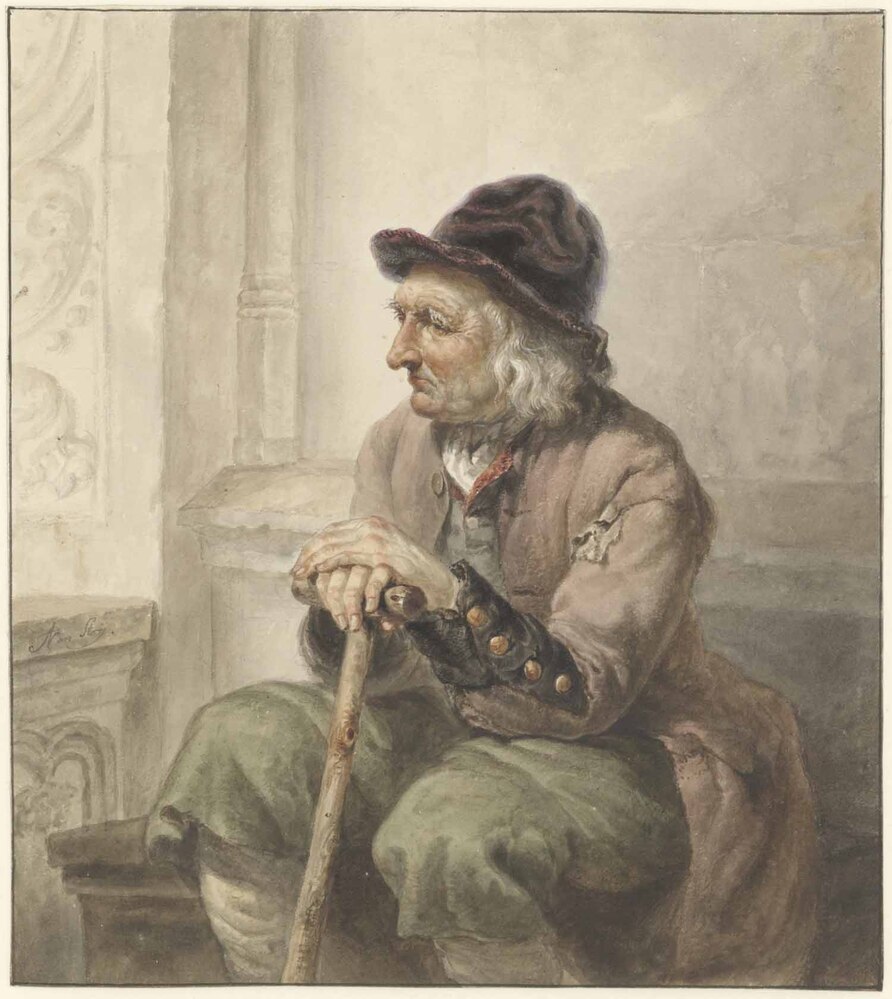 Charles Dumas suggereert in In helder licht: Abraham en Jacob van Strij, Hollandse meesters van landschap en interieur omstreeks 1800 dat de tekening in het Amsterdam Museum voor het eerst opduikt op de veiling J.C. Pruyssenaar in Amsterdam, op 27 februari 1804. Daarin wordt een werk als volgt beschreven: ‘Een zittend oud man, rustende met beide handen op een Wandelstok; geteekent met kleuren.’ Het is inderdaad waarschijnlijk dat dit het betreffende werk is.