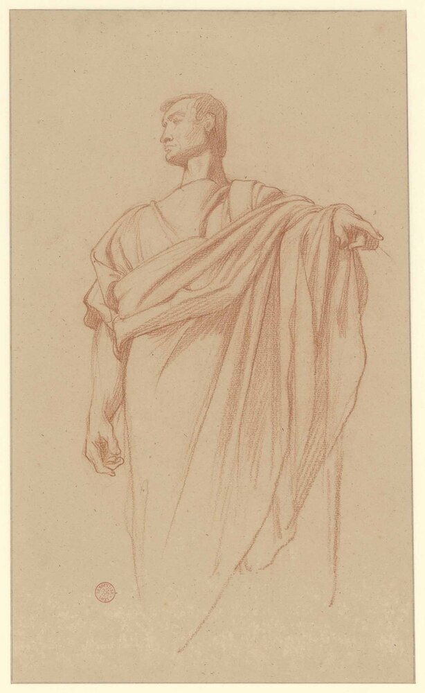 It is not entirely certain that this stury of a standing man is actually related to Les Martyrs. The haughty, erect figure in the second row of sears has a bears, is posed differently, and has fewer folds in his toga. Auburn suggests that Benouville used friends and relatives as models for some of the Roman spectators, which might explain why the faces in the painting differ from those in the earlier watercolor. It is not clear whether the sheets in the Amsterdams Historisch Museum relate to the watercolor or the painting. One possible clue is provided by the relative sizes of the studies and the figures in the completed works. The male figure in this sheet, for example, is approximately one-third the size of the standing man in the painting, but exactly matches the corresponding figure in the watercolor.