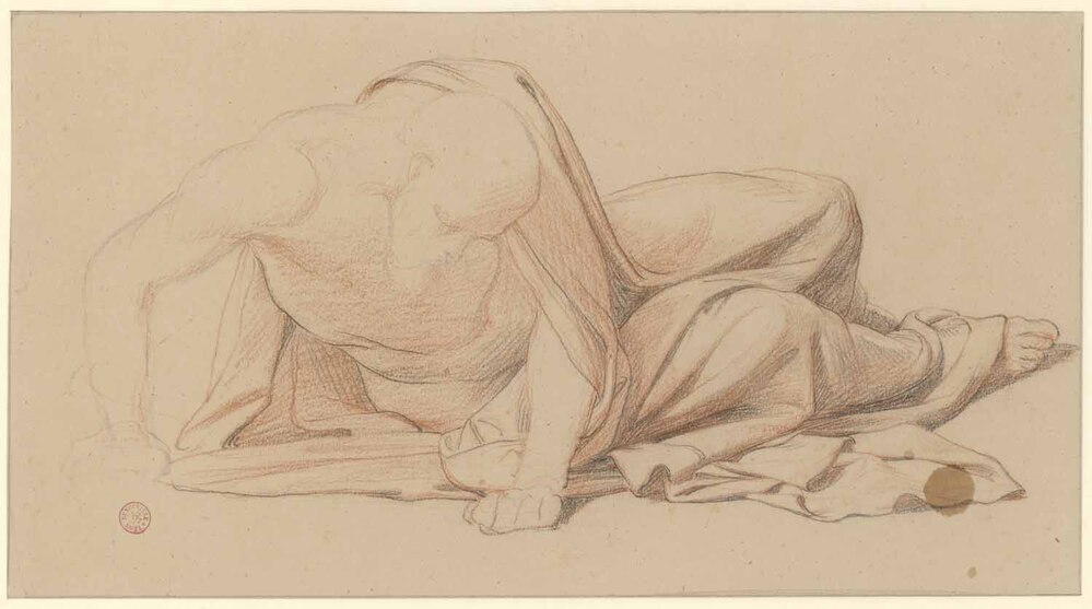 This is a study for the prostrate figure in the right foreground of Les Martyrs, who is being shielded from the Roman soldier by a woman. The finished version is approximately six times larger but is otherwise unchanged, apart from the addition of a stick in the man’s left hand.