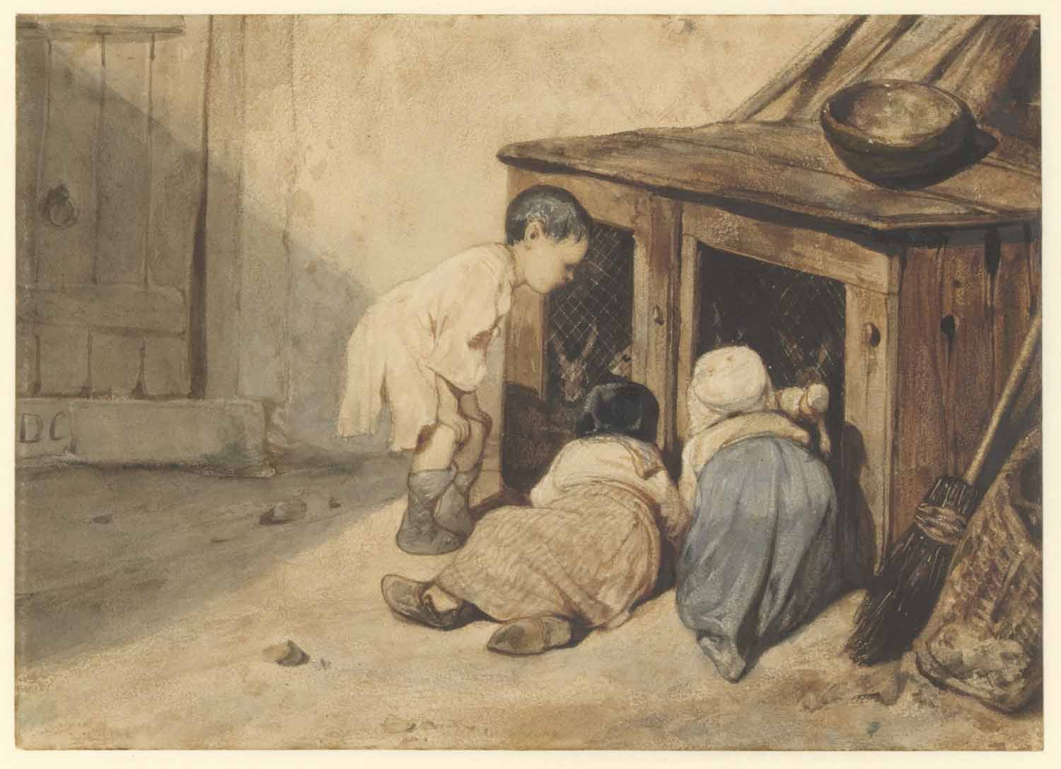 - Drie kinderen bij een konijnenhok, 1823 - 1860