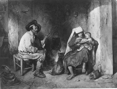 - In een binnenhuis zit een Italiaan bij eene vrouw, die haar kind te eten geeft, 1823 - 1860