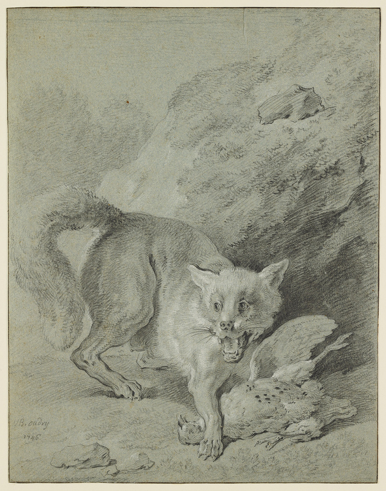 - Een vos met een patrijs. Fr.titel: Renard avec une perdrix morte., 1746