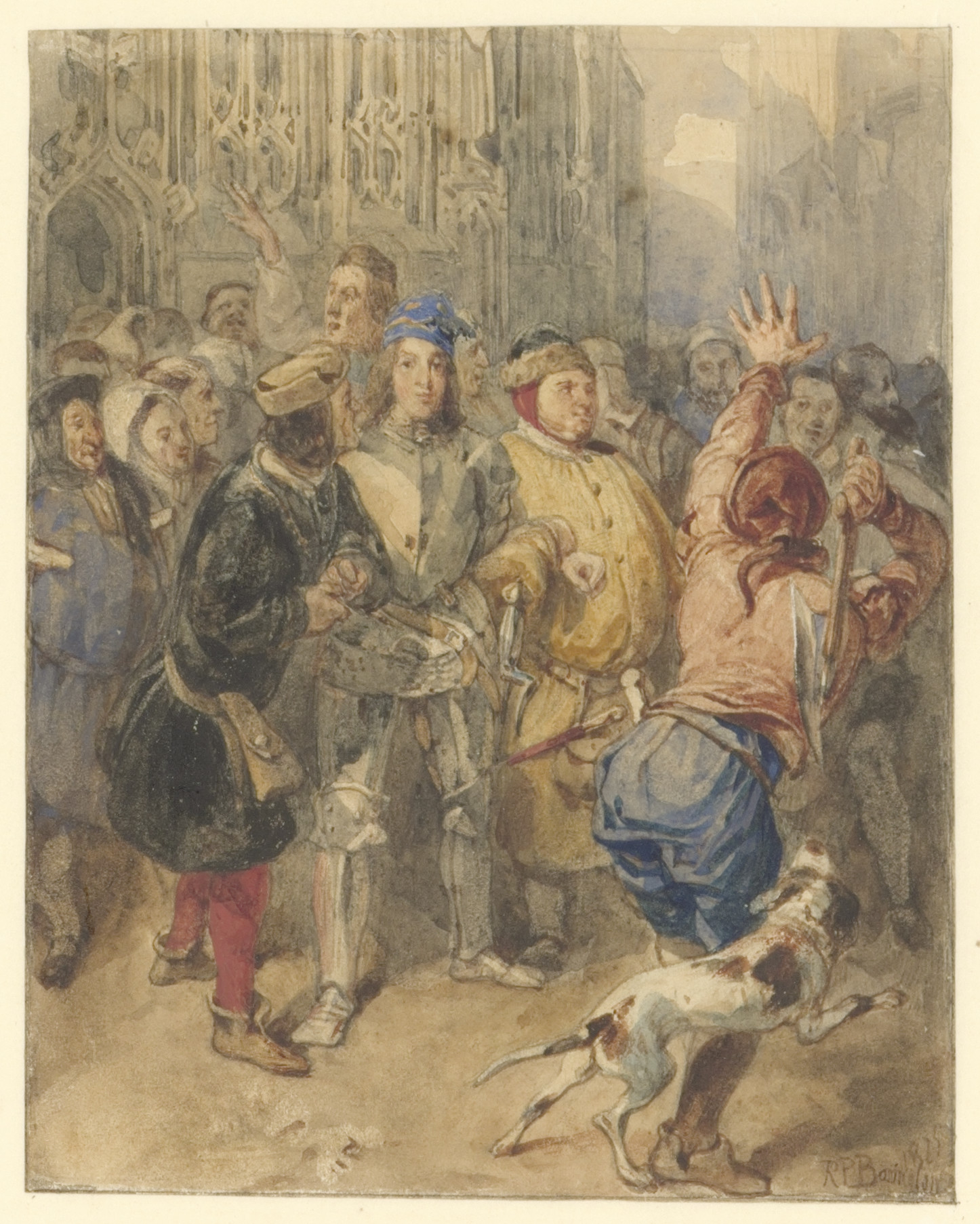 The incident depicted by Bonington occurs in Chapter 19 of Scott’s novel. Two Liège burgomasters, Pavillon and Rouslaer (the latter “a corpulent dignitary, whose fair round belly, like a battering-ram, ‘did shake the press before him’”) take the bewildered Durward by the arms. He is surrounded on all sides. “Before him Nikkel Blok, the chief of the butchers’ incorporation, hastily summoned frm his office in the shambles, brandished his death-doing axe, yet smeared with blood and brains, with a courage and grace which brantwein alone could inspire. Behind him came the tall, lean, raw-boned, very drunk and very patriotic figure of Claus Hammerlein, president of the mystery of the workers in iron, and followed by at least a thousand unwashed artisans of his class.” Bonington has not succeeded entirely in conveying the press and urgency of the crowd. In fact the overall impression of the scene which he has composed around the hapless Durward is rather unconvincing. The various personalities, though, are easily recognizable: the corpulent Rouslaer, Blok, Hammerlein, and the smartly-dressed Pavillon (“a jolly, stout-made, respectable man [with a] velvet cloak and gold chain”). The dog is Bonington’s own contribution to the proceedings.