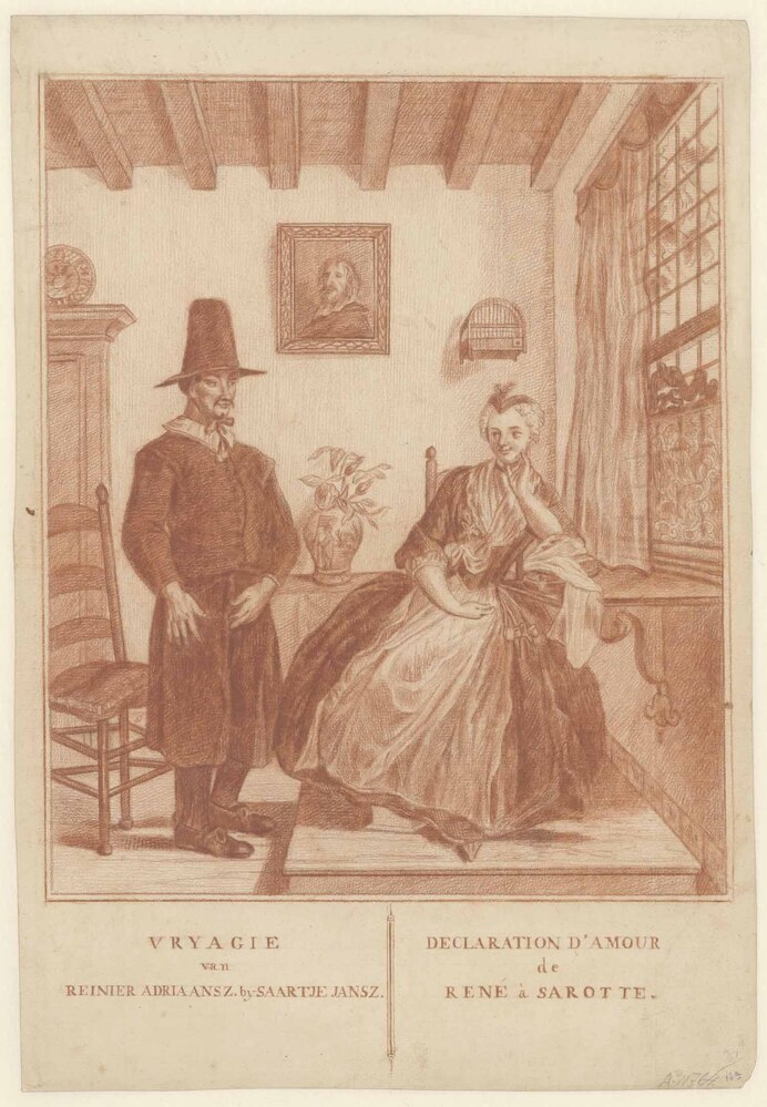 opschrift onderaan: VRYAGIE/van/REINIER ADRIAANSZ. by SAARTJE JANSZ. en DECLARATION D'AMOUR/de/RENÉ à SAROTTE.