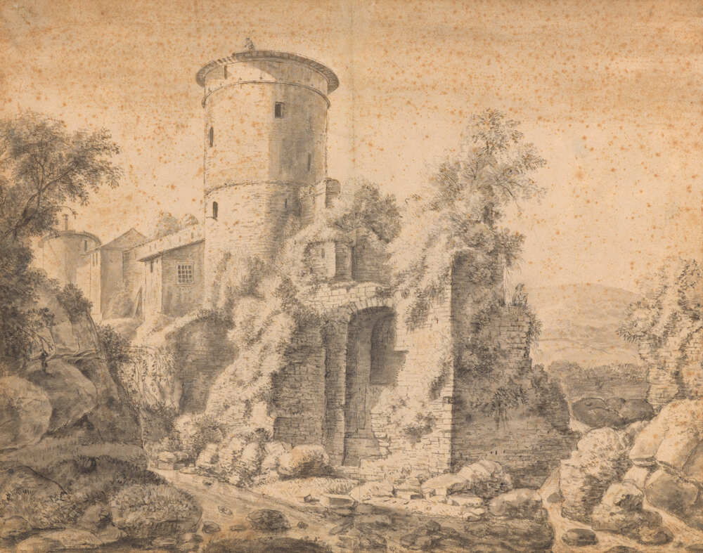 Veiling Ploos van Asmtel 1800 p. 100, Kunstboek R, nr. 28: 'Een Rotonde en Ruïne; met zwart Kryt en O.I. Inkt, door A. Waterloo' (f 40:-:-, aan Roos); Collectie Willet-Holthuysen, legaat 1859