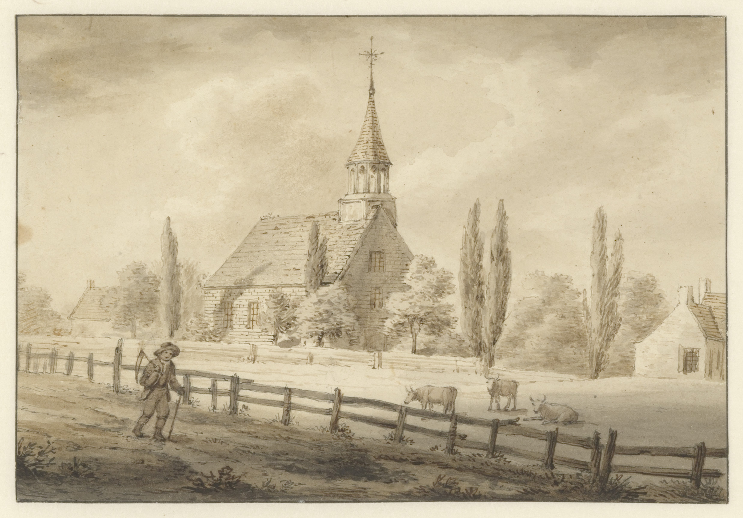 Deze in 1806 gedateerde tekening maakte Apostool tijdens zijn korte verblijf in de Verenigde Staten. Hij tekende een kerk en twee huizen in de wijk Flatlands, gelegen in het zuidoosten van Long Island in Brooklyn. Op de voorgrond zijn een man met een stok en een zeis te zien, en achter een hek drie koeien in een weiland.