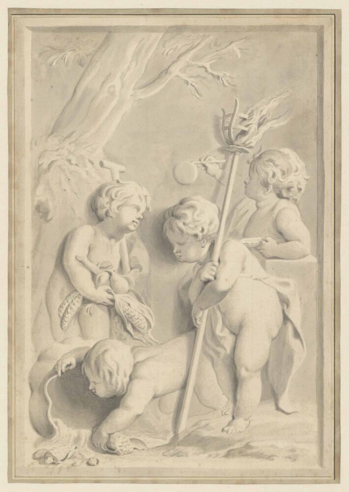 Voorgesteld is een allegorie op de vier elementen. De putto met de vruchten en groenten verbeeldt de aarde, de putto bij de urn waar water uitstroomt het water, de bellenblazende putto de lucht en de putto met de vuurkorf het vuur. ( Leonoor van Oosterzee)