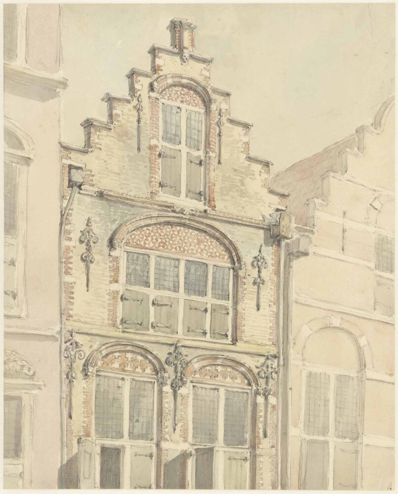 Op deze tekening van Johannes Jelgerhuis (1770-1836) ligt duidelijk de nadruk op het middelste gebouw. Door dit gebouw tot in detail uit te werken, verschuift de aandacht naar deze woning. Doordat de focus zo duidelijk op een pand ligt doet de vraag rijzen of het hier een bijzonder pand betrof waar Jelgerhuis een studie naar heeft gemaakt. Normaliter worden in stadsgezichten immers alle panden op een verglijkbare wijze getekend. Het is onmogelijk om het exacte adres van dit gebouw te vinden, enerzijds omdat het pand niet helemaal zichtbaar is anderzijds omdat hier een veelvoorkomende Dordtse gevel te zien is. Deze gevel kenmerkt zich door het gebruik van rondbogen boven de vensters. Deze specifieke gevel werd in door de metselaarsgilde van Dordrecht als meesterproef gebruikt. Wat de vraag doet rijzen of Jelgerhuis misschien deze bijzonderheid vast wilde leggen. De tekening is waarschijnlijk in de periode na voltooiing kleiner gemaakt, de afsnijding van de gevel aan de onderkant van het blad doet ongelukkig aan. ( Mike Hermsen)