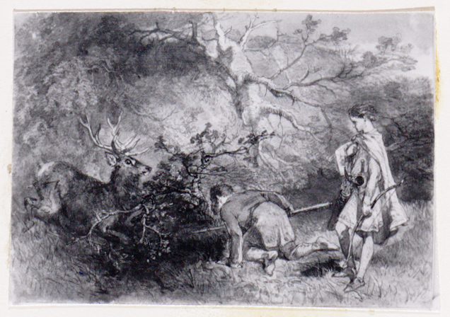 - Geknielde Vrydhelm houdt een lans vast, die hij naar een door de jagers achtervolgd hert gaat gooien. De jonge Helkwin staat achter hem (520-560 na J.C.), 1858