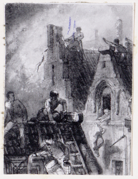 - Op de daken van de huizen, op de hoge puntgevels, in een wijk met nauwe straten, bestrijden de brandweermannen een hevige brand. Een vrouw gooit kleren uit een raam, 1860