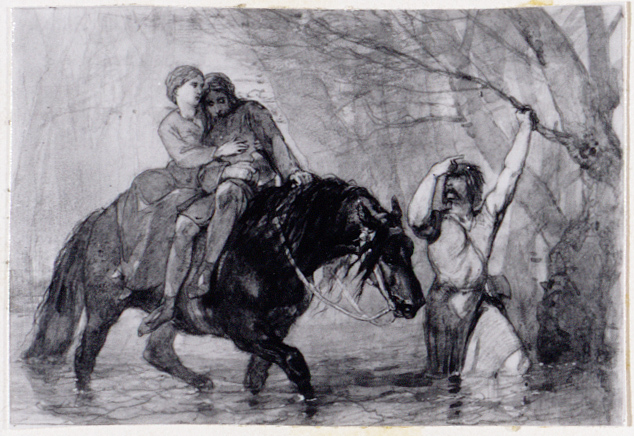 - Een gewonde man ondersteund door een vrouw zitten op een paard, dat geleid wordt door een krijgsman, die moeilijk vooruit komt in het door de overstroming gestegen water (520-560 na. J.C.), 1859