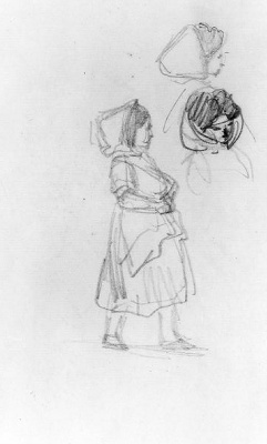 - Studieblad met naar rechts lopend meisje en twee meisjeshoofden (recto). Mannenhoofd in de vorm van een kan (Verso), 1840 - 1881