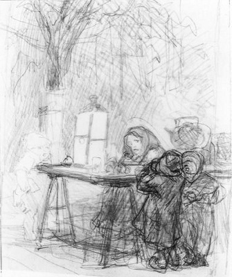 - Koopvrouw achter een schragentafel, Een aantal kinderen staan om de tafel., 1840 - 1881