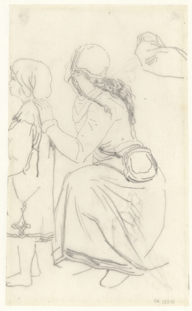 - Vrouw in historische kleding in zittende houding bij een staand kind, 1840 - 1881