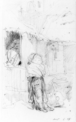 - Meisje in de sneeuw, leunend tegen een huis in Amsterdam, 1855