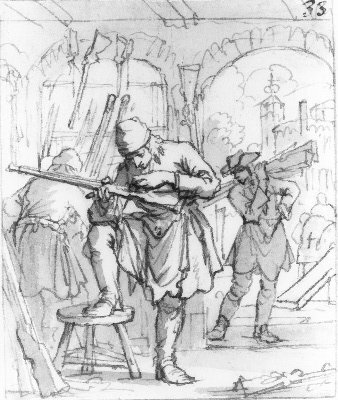 Voorstudie voor prent uit "Het menselyk bedryf" door Jan Luyken. Tekening waarnaar geen prent bekend is.- Trefwoorden