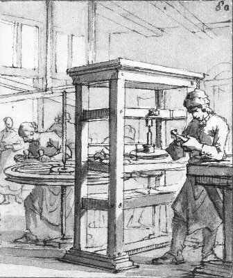 Deze tekening van Jan Luyken laat zien hoe het er in een diamantslijperij anno 1694 aan toe ging. Een vrouw draait aan het grote wiel, dat de slijpsteen in beweging brengt. Dit was toen de vaste taak voor vrouwen. Ondertussen bekijkt de diamantslijper zelf een, in een tang geklemde diamant, die hij op het punt staat te gaan slijpen of net geslepen heeft. ( Nel Klaversma)